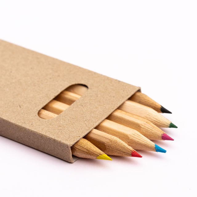 In der nachhaltigen recycelten Papierverpackung sind 6 Buntstifte in verschiedenen Farben (dunkelblau, schwarz, rot, pink, cyan und gelb) aus Lindenholz enthalten.
