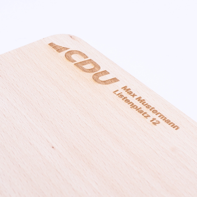 Unser individuell graviertes Vesperbrett aus massivem Buchenholz mit Ihrem Namen und Ihrem Listenplatz ist ein absoluter Hingucker und eine tolle Möglichkeit für nachhaltig und langfristig für sich zu werben.